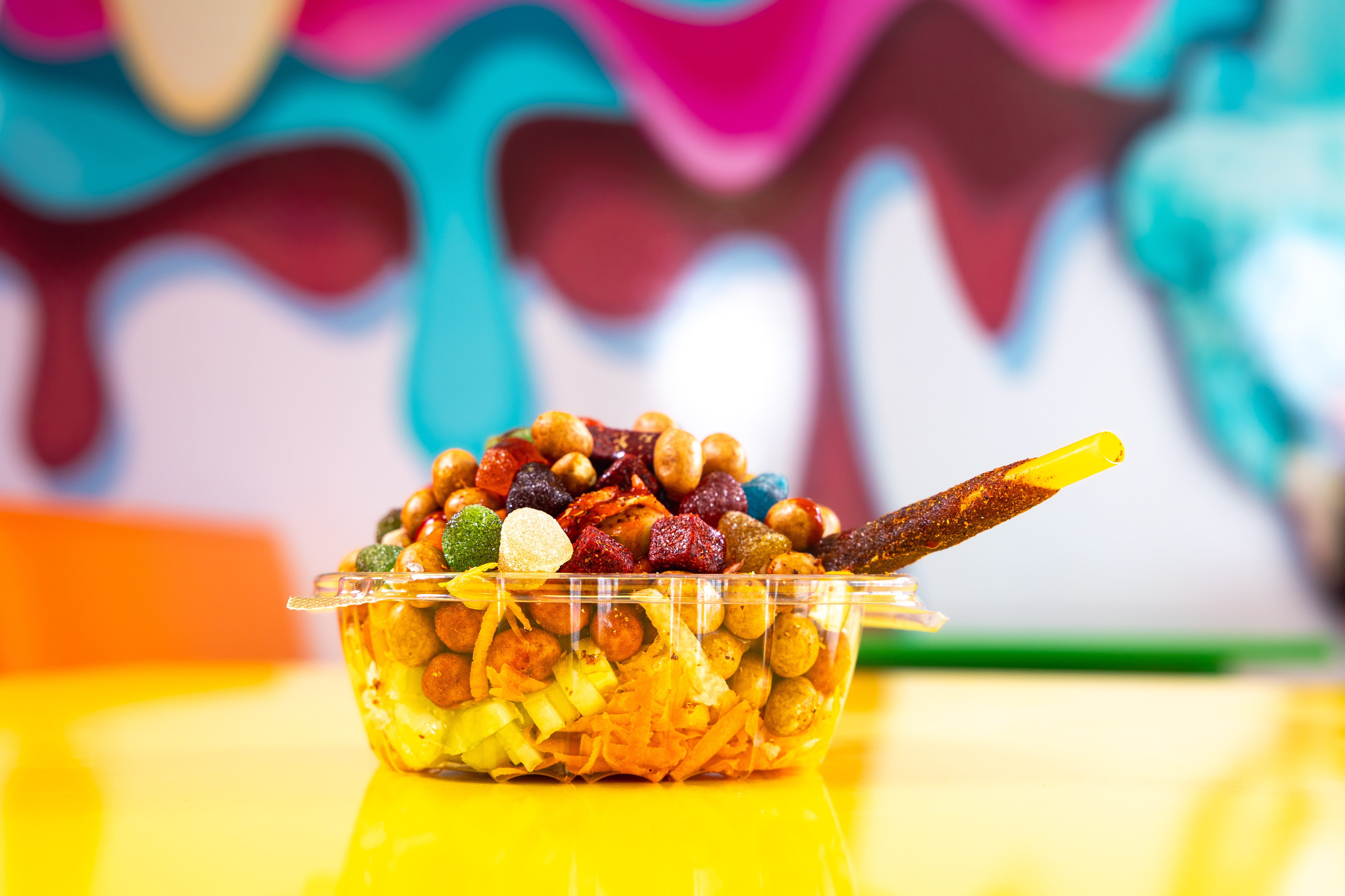 Prepared with Cucumber, Jicama, Carrot, Peanuts, Gummies, Spicy Peanuts, Tamarind Candy Stick