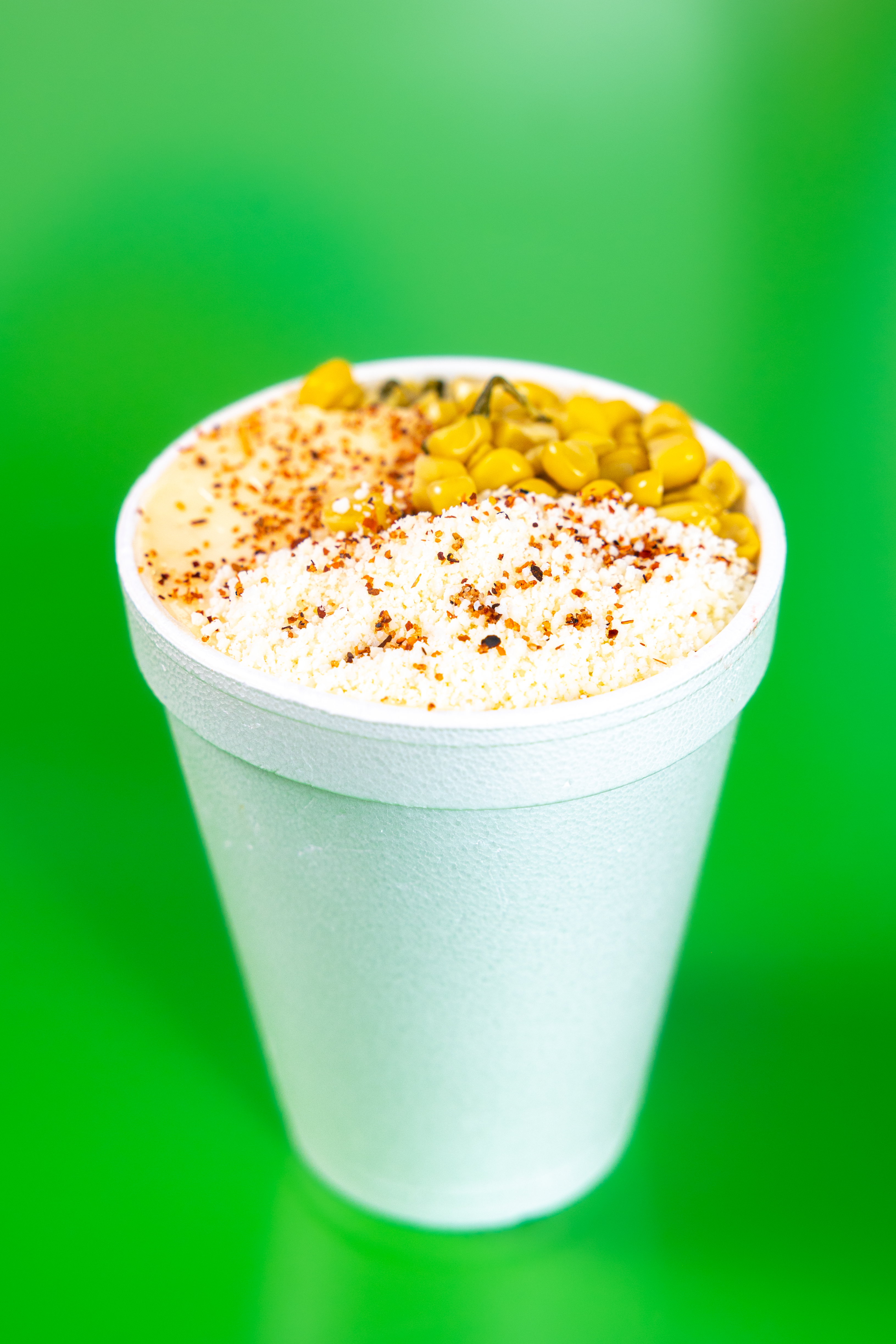 Corn in cup with mayo, cotija cheese, lemon juice and tajin.