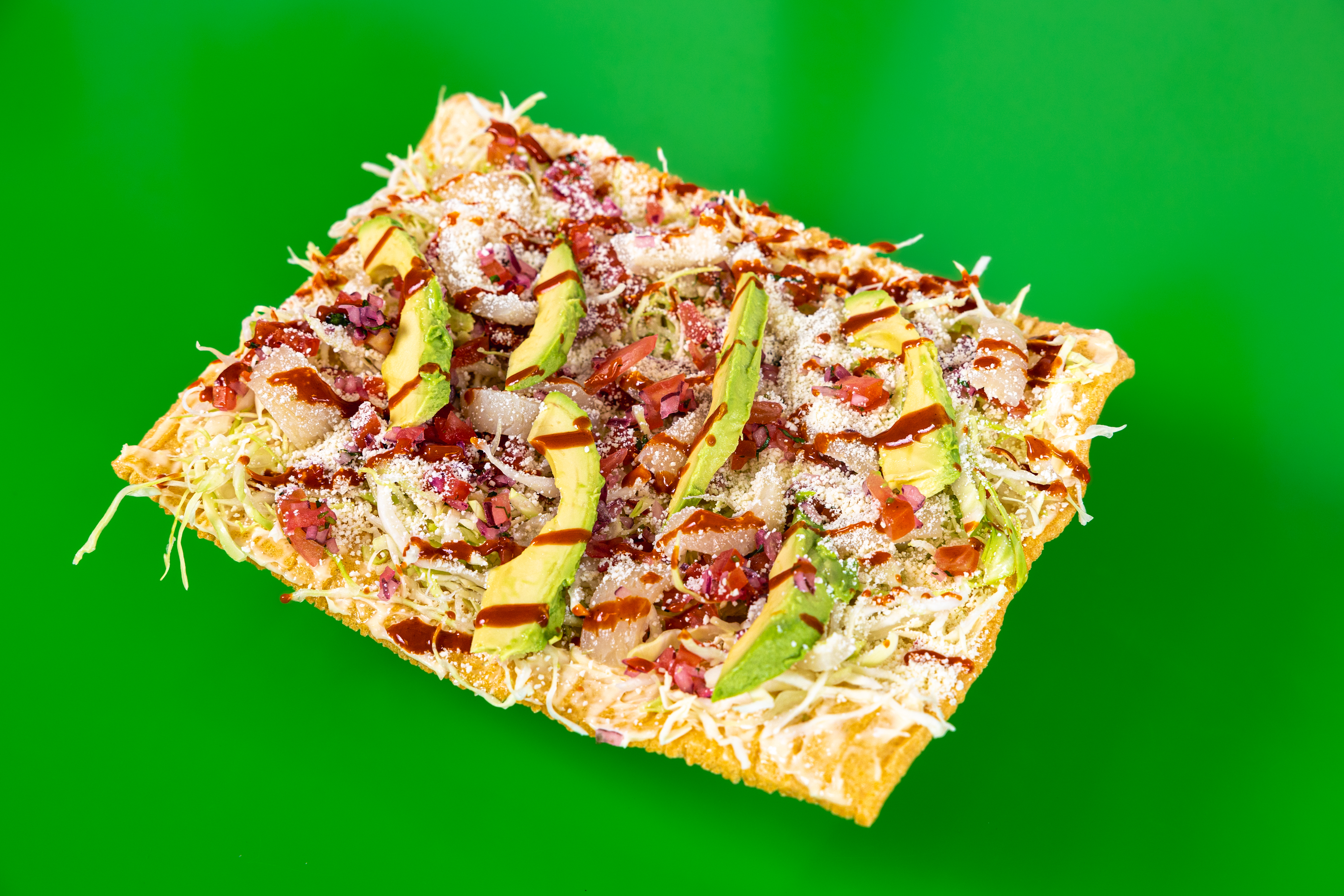 Prepared Fried Flour Chips with Mayo, Cabbage, Pico De Gallo, Cotija Cheese, Avocado, Sour Cream and Valentina Hot Sauce